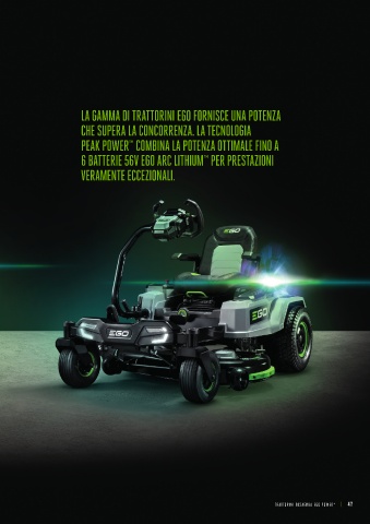 LA GAMMA DI TRATTORINI EGO FORNISCE UNA POTENZA CHE SUPERA LA CONCORRENZA. LA TECNOLOGIA PEAK POWER™ COMBINA LA POTENZA OTTIMALE FINO A 6 BATTERIE 56V EGO ARC LITHIUM™ PER PRESTAZIONI VERAMENTE ECCEZIONALI. + TRATTORINI TOSAERBA EGO POWER | 47