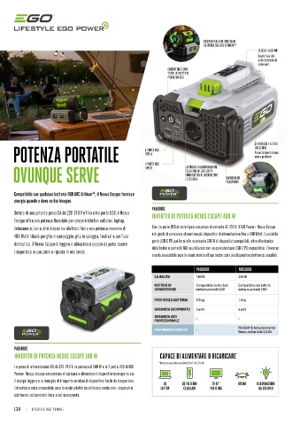 trasportato in uno zaino o riposto in una tenda. delle batterie portatili EGO se utilizzate con un caricabatterie USB-C PD compatibile. L’inverter EGO 56V ARC Lithium TM