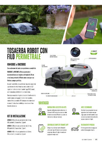 PESO ~15 kg ~15 kg ~15.5 kg 500 picchetti, 3 connettori, 2 giunti Collega il tuo telefono tramite Bluetooth Si ferma quando rileva la pioggia per
