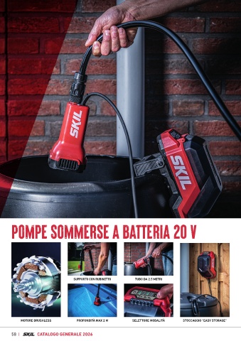 POMPE SOMMERSE A BATTERIA 20 V SUPPORTO CON RUBINETTO TUBO DA 2.5 METRI MOTORE BRUSHLESS PROFONDITÀ MAX 2 M SELETTORE MODALITÀ STOCCAGGIO “EASY STORAGE” 58 CATALOGO GENERALE 2026